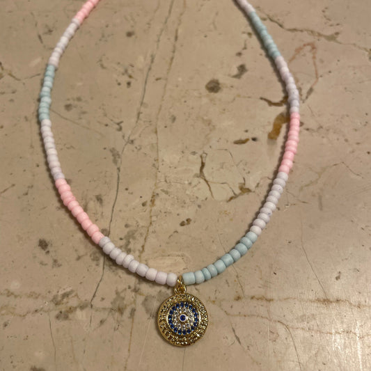 Ombre thin beaded necklace in pastel colors and evil eye charm