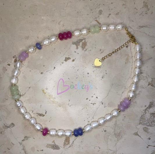Colorful natural freshwater pearl necklace with natural rondelle stones and gold-plated beads