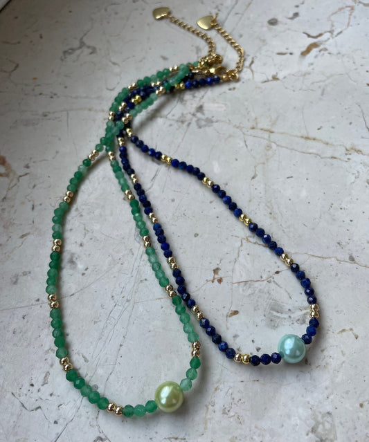 Delicate short beaded crystal necklace with blue lapis lazuli green aventurine gold-plated beads artificial pearl
